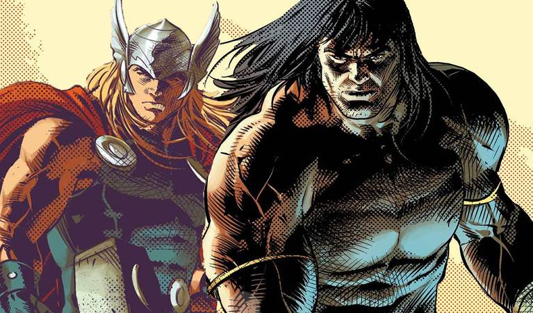 Di Marvel Comics, Thor memang cukup sering berurusan dengan para karakter protagonis lain. Salah satunya adalah Conan the Barbarian yang pada dasarnya hanyalah seorang manusia biasa yang kebetulan kehidupannya sangat barbar. Di komik What If, ketika Thor terluka parah setelah melakukan pertarungan, dia mencoba untuk memberikan Mjolnirnya kepada Conan yang memang mahir dalam menggunakan senjata. Seketika Conan yang awalnya manusia biasa berubah menjadi dewa dan mendapatkan kekuatan Thor untuk mengalahkan musuh. Hal ini telah membuat Conan jauh lebih barbar dari sebelumnya.
