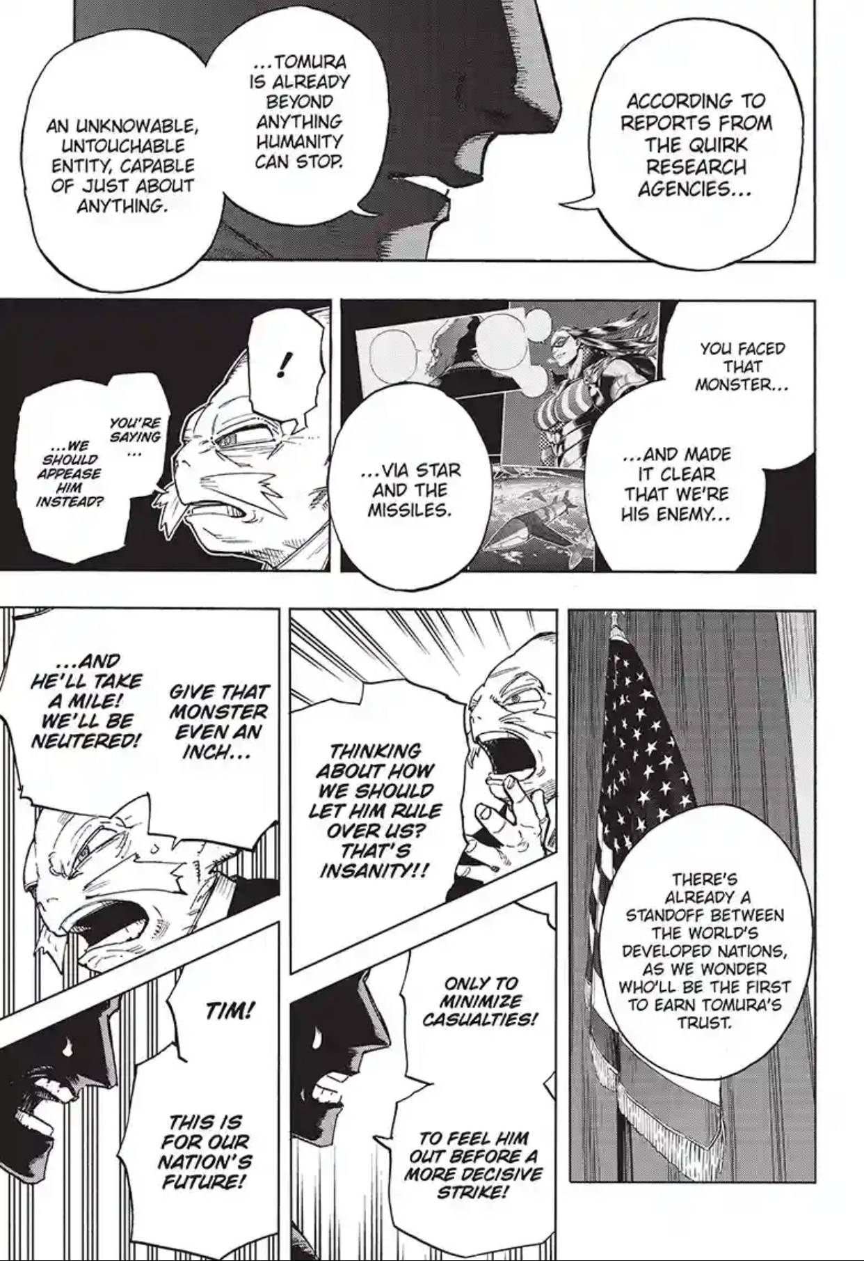 Sayangnya, usulannya tersebut tidak diterima dengan baik. Pasalnya, sang Presiden mengutip laporan dari agensi riset quirk dan menyebutkan bahwa Shigaraki tidak bisa dihentikan. Dia justru memiliki idenya sendiri untuk tidak menyerang Shigaraki atau melakukan tindakan apa pun yang bisa membuat sang karakter mengarahkan tujuannya kepada Amerika.