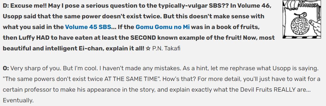 Dalam kolom SBS Volume 48, seorang fan bertanya kepada Oda Sensei mengapa buah iblis Gomu Gomu bisa muncul di ensiklopedia buah iblis setelah Luffy memakannya. Namun, Oda sendiri tidak memberikan jawaban untuk pertanyaan itu. Dia justru menjelaskan bahwa Vegapunk yang mengetahui jawabannya. Dalam hal ini, Oda ingin menyampaikan bahwa Vegapunk merupakan kunci untuk semua hal tentang buah iblis one piece.